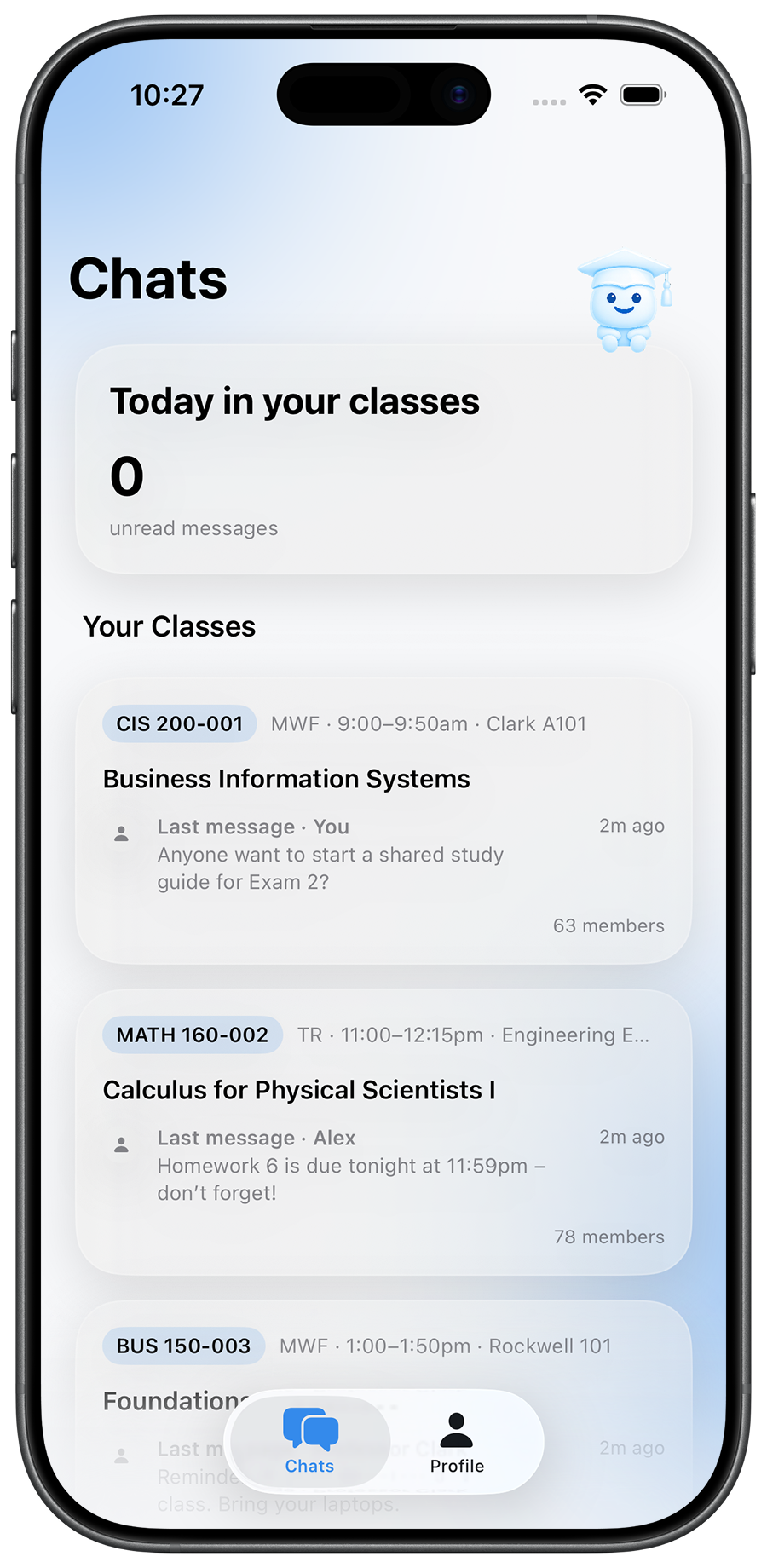 Echo brings structure to conversations by organizing chats around your classes, making it easier to ask questions, share resources, and stay engaged.