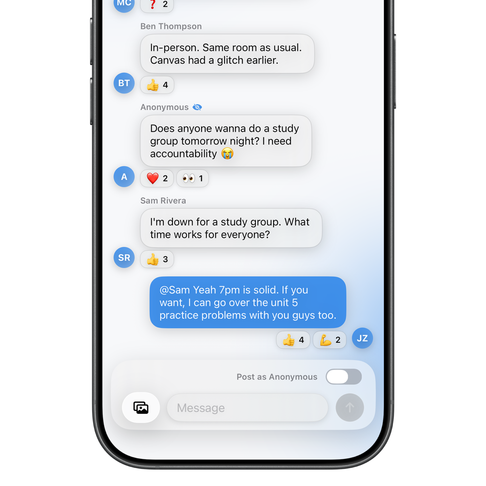 Ask questions, coordinate study groups, and share updates with the people actually in your class.